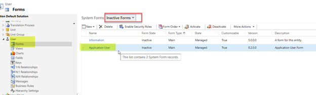 In some D365 instances the 'Application User' form along with the 'Application Users' view is missing or it is not active. But we can enable Application User form and view from CRM customization itself. To do that please follow the below steps.